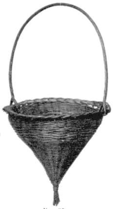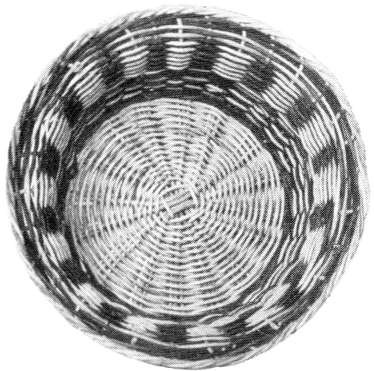 Between Nos. 1 to 10 spokes and Nos. 18 to 26 spokes, the weaving is the simple over and under weave. Owing to insertion of design it is sometimes necessary to pass the weaver back of two spokes to get the correct weave. Follow the fifteen rows of weaving with three rows of triple twist. Bend the spokes inward while making the triple twist. Holding the spokes in the same position work twenty rows plain weave. Follow this with five rows triple twist. Complete the basket with the border under Model 14.