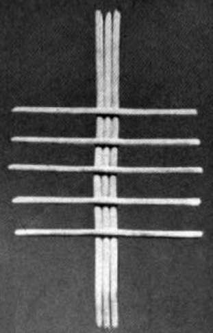 Place the 9 spokes in a horizontal position, equal distances apart; or if two pieces of wood, nine inches long, are available, make 9 holes in each piece 3⁄4 inch apart. Through these holes insert the nine 15 inch spokes. This holds the spokes in a firm position and makes the weaving simpler.