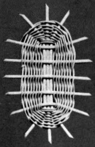 Make a base 81⁄2 inches in double weaving No. 4 reed. Insert the 31 29-inch spokes. Turn sharply upward and make one row of 3-rod coil. Insert the 31 15-inch spokes and work three rows of triple twist. The spokes are now double and should be held straight. Make eight rows double weaving and four rows in triple. Leave one inch space open. Find the middle of a long weaver, place it around one of the double spokes and weave seven rows in pairing.