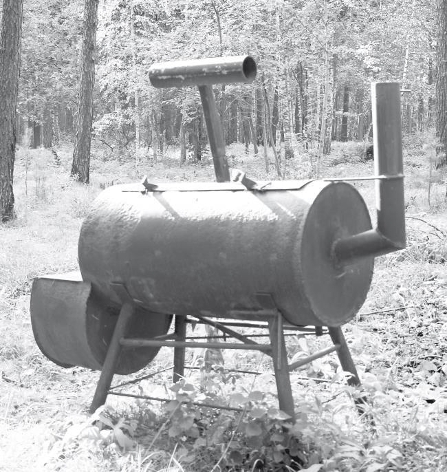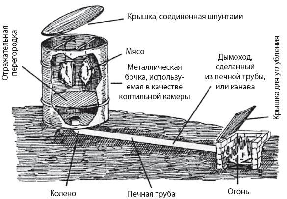 Теперь посмотрим, как выглядит коптильня в натуральную величину. Пример простейшего приспособления для приготовления копченостей холодным способом вы можете увидеть на форзаце в начале этой книги (рис. 1). Камера сгорания щепы в данном случае изготовлена из трубы диаметром приблизительно 30 см. От нее отходит труба немного меньшего диаметра (10 см), которая передает дым непосредственно в коптилку, изготовленную из обыкновенных деревянных брусков. Если вы обратили внимание на камеру сгорания, то не могли не заметить вторую трубу, которая выходит из нее и ведет вверх. Такая труба предназначена для выхода излишков коптильного дыма. Дело в том, что для достижения равномерного сгорания щепы нужен немалый опыт в копчении продуктов разного рода, а дополнительная труба способствует выходу излишков сгорания этой щепы, это дает возможность равномерно коптить продукты питания. Устройства такого рода можно с легкостью изготовить из подручных материалов.