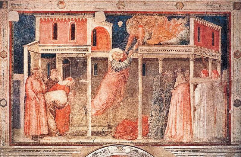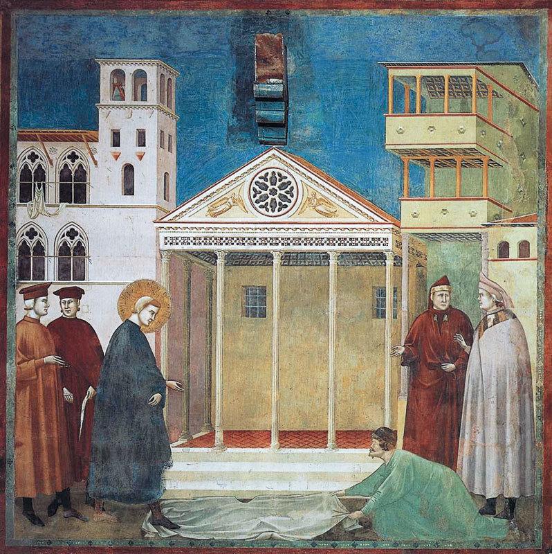 Джотто ди Бондоне. Сцены из жизни святого Франциска: юродивый предсказывает грядущую славу молодому святому Франциску. Ок. 1297–1300