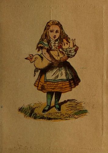 You don’t see why I call them ‘Surprises’? Well, take the Case in your left-hand, and regard it attentively. You see Alice nursing the Duchess’s Baby? (An entirely new combination, by the way: it doesn’t occur in the book.) Now, with your right thumb and forefinger, lay hold of the little book, and suddenly pull it out. The Baby has turned into a Pig! If that doesn’t surprise you, why, I suppose you wouldn’t be surprised if your own Mother-in-law suddenly turned into a Gyroscope!