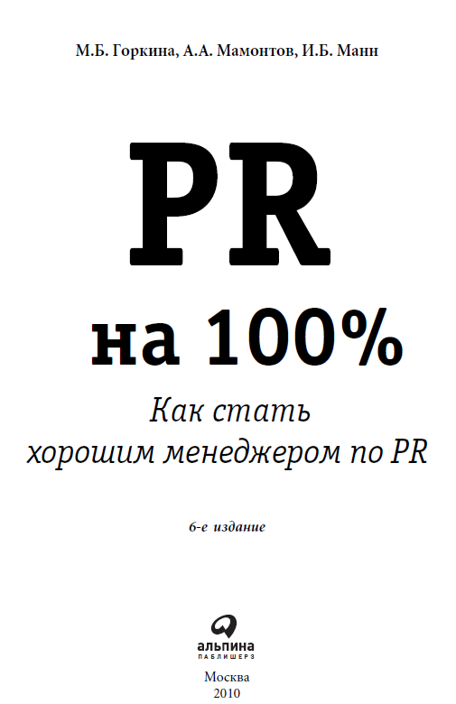 PR на 100%: Как стать хорошим менеджером по PR / М. Б. Горкина, А. А. Мамонтов, И. Б. Манн — 6-е изд. М.: Альпина Паблишерз, 2010. — (Серия «Бизнес на 100%).