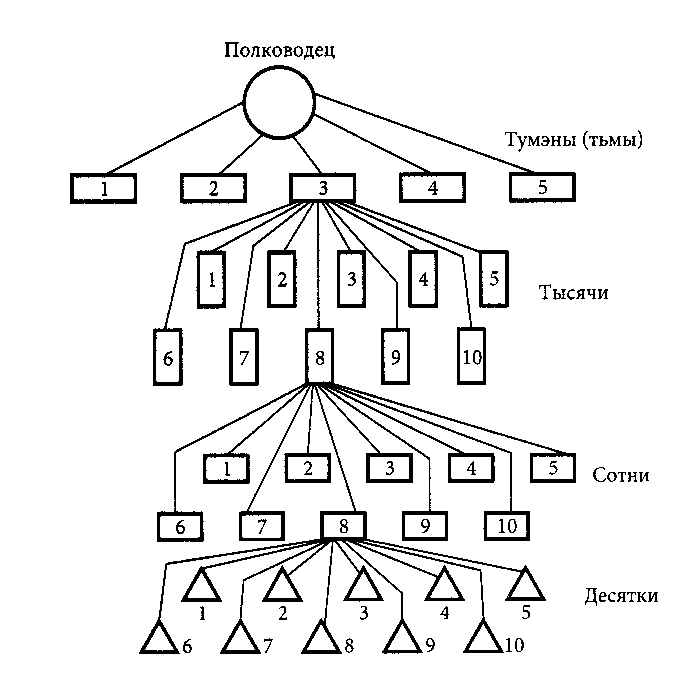 Все люди разделены на десятки, в каждой десятке один человек назначен начальником других девяти; из среды десяти начальников одному дано имя сотника, и вся сотня ему подчинена. Таким родом дело идет до тысячи и достигает десяти тысяч, над которыми поставлен начальник, называемый темником. В сем соответствии и распорядке, какое дело ни возникнет, потребуется ли человек или вещь, дело передается темнику, этим последним – тысяцкому, и так далее до десятника.