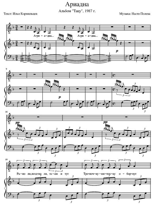 «Ариадна» – первая песня Насти Полевой. Уже в ней проявились некоторые особенности ее стилистического языка, наметились основные признаки творчества: яркий мелодизм, игра различными тембрами, прихотливый ритм, смена размеров и фактуры, использование крепких риффов и обращение к мифологической тематике.