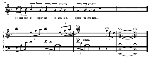 Припев «Ариадны» – образец мелодизма и песенности: неторопливые триольные распевы с остановками после каждой фразы, гармонические фигурации с движением по звукам аккордов ре минора и фа мажора в басу и нисходящая мелодия гитары, заимствованная из вступления. Второй раздел припева, как и куплет, начинается с квинтовой интонации, но затем звучит та же гитарная нисходящая тема. Её спокойные повторяющиеся триольные секундовые ходы создают ощущение покачивания. Гармоническая последовательность аккомпанемента (t – VI–III–VI) звучит в разложенном виде, по типу фигураций. Кажется, что в этом разделе тема замедляется, но такая иллюзия создаётся лишь благодаря разреженной фактуре у группы инструментов.