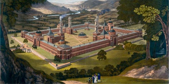 Параллельно в 1800 годы, во многом в противовес работным домам, английский философ-социалист Роберт Оуэн предложил схожую утопическую концепцию кооперативного индустриального поселения. Его хлопкопрядильная фабрика в Нью-Ланарке в Шотландии, где трудилось больше двух тысяч человек, славилась социальной поддержкой хозяином своих рабочих (с 1968 года получила статус памятника всемирного наследия ЮНЕСКО). Однако главная затея Оуэна, поселение «Новая Гармония» в штате Индиана в США6, так и не была реализована из-за бесконечных споров и неурядиц — порядка восьмисот семей так и не смогли договориться ни о совместном управлении, ни о пользовании землей, ни тем более о новом строительстве (Оуэн представлял коммуну в виде «замка» с фабричными трубами вместо башен и кирпичными жилыми корпусами, охватывающими прямоугольный двор). Сохранилось 25 зданий, деревянных жилых и кирпичных общественных, однако еще при жизни Оуэна основные постройки перестали быть коллективной собственностью и вместе с землей были приватизированы. В 1817–1824 годах было выстроено четыре общежития; сохранившиеся два представляют собой трехэтажные кирпичные здания (одно из них, изначально служившее колонистам местом собраний, позднее, еще в XIX веке, было переоборудовано под театр)7.