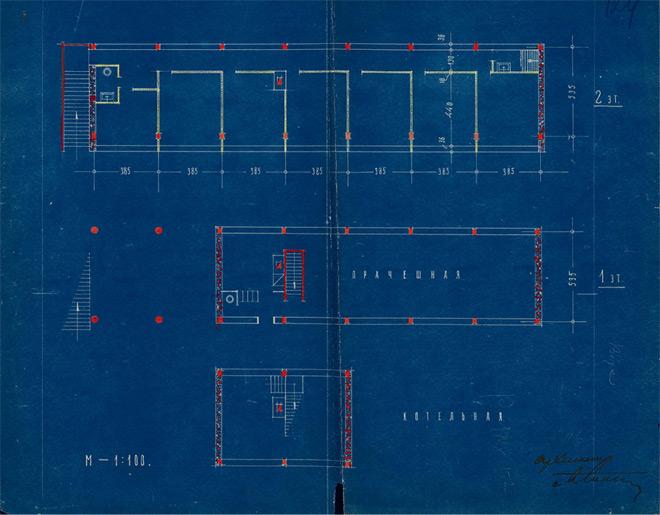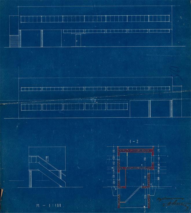 Планы, фасады и разрезы служебного корпуса. 1930. ЦГА г. Москвы