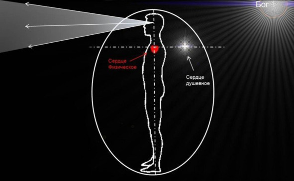 Как видно из рисунка, отражающего не обращённое (рациональное) состояние сознания, ум человека, символизирующий зрение, направлен сугубо во внешний мир, а не во внутренний. При этом сознание сердца остаётся полностью закрытым и Бог для рационального ума как бы не существует. В процессе обращения ума к сердцу ситуация меняется радикально.