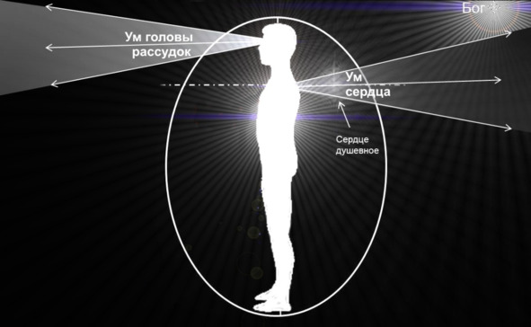 Ум, направленный ранее сугубо во внешний мир, после покаяния (обращения), как бы обращается вовнутрь самого себя через канал сердца (совесть) и открывает для себя Бога и внутреннее пространство души. Данное внутреннее пространство души (клеть души) представлено следующими уровнями или оболочками психического бытия.