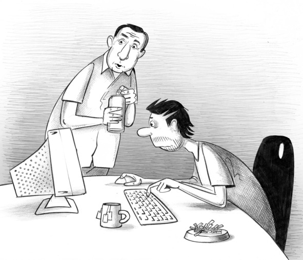 Шмаги подошёл к рабочему столу Марка и грузно сел прямо на стопку бумаг: