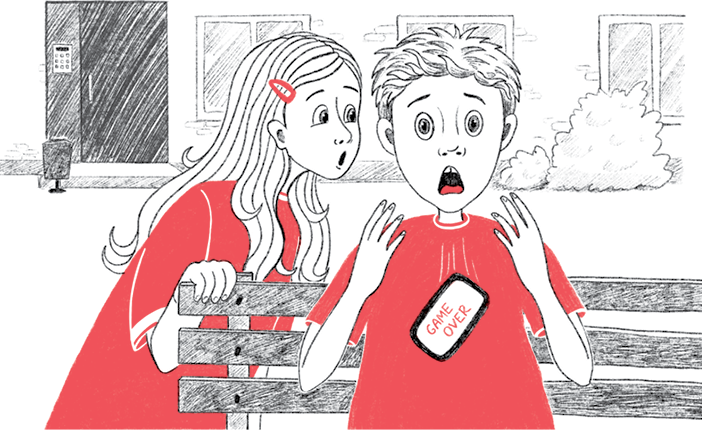 Однажды скачал он новую игру. Такую интересную, что ни на секунду оторваться не мог. Вышел утром из дома — идёт в школу и играет. Ничего вокруг не замечает. Лужа на дороге — он прямо по луже идёт. Ноги промочил и даже не почувствовал. На светофоре красный свет — а он прямо на красный шагает. Чуть под машину не попадает. Водители гудят, кричат, а он даже не слышит! Еле-еле его объехали.