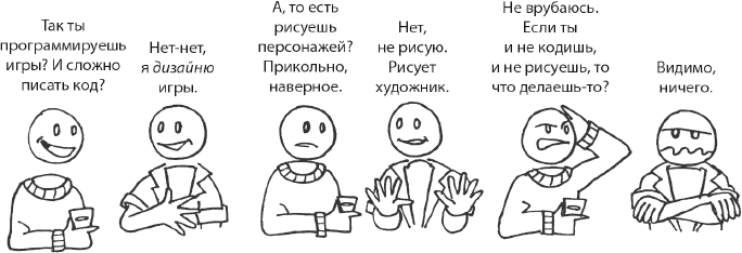 Чудовищное открытие – но осознать это должен каждый. Вот я стоял перед ними, новенький, с иголочки, гейм-дизайнер, заваливал их новыми, с иголочки, дизайн-документами, а они и не думали читать! Ну и что мне было делать? Чтобы решить проблему и заставить коллег открыть мои диздоки, я начал рисовать их в виде комиксов. И знаете что? Сработало. Комиксы доносили мои мысли до товарищей. С тех пор я делаю так всегда – да, в том числе с теми играми, что стали бестселлерами. Поэтому в книге будет много иллюстраций – чтобы вы не бросили читать и поняли мои мысли. Поймете их, примените к собственным творениям – и тоже станете отличным дизайнером.