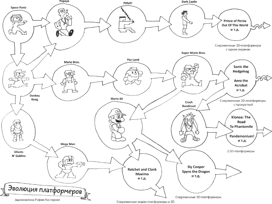 Есть и еще один секрет: эта моя мысль тоже неоригинальна. В книге A Theory of Fun for Game Design (2004)[47] Рэф Костер рисует схему эволюции шмапов. Отталкиваясь от нее, покажу вам свою – об эволюции дизайна платформеров.
