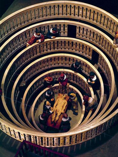 10. Макет анатомического театра, Падуя, 1594 г. На секционном столе лежит труп в окружении профессиональных анатомов, ученики наблюдают за вскрытием с многоярусных балконов