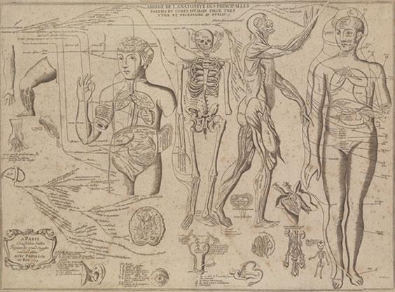 13. Иллюстрация к «Краткому пособию по анатомии основных частей человеческого тела» (Abrégé de l’anatomie des principales parties du corps humain. Paris, 1634/1679), изданному Юбером Жайо с королевского соизволения. Художники Ж. Бланшен и Ж. Дюмулен