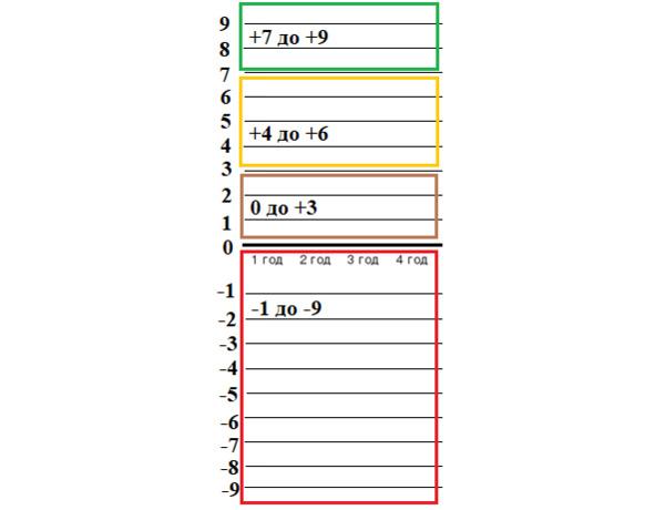 Негативная зона — это та зона, где линия графика опускается ниже нуля. От –1 до –9. Этот период насыщен отрицательными событиями, у человека пропадает желание что-то делать, опускаются руки, жизнь ставит палки в колеса, человек вязнет болоте. Что бы человек ни предпринял в этом диапазоне, ему закручивают руки, все действия и слова оборачиваются против самого человека. Зона насыщена оскорблениями, унижениями. Человек находится в трудном психологическом состоянии, вспоминаются незалеченные и непроработанные детские психологические травмы. Обостряются хронические состояния, вероятность летального исхода в разы увеличивается. Период кризиса, депрессии и застоя.