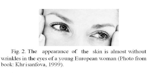 Due to the decrease in the number of sweat and sebaceous glands the skin becomes drier, its elasticity is lost. In men, the decrease in sebum occurs later than in women. The most obvious signs of aging are wrinkles. With age, there are multiple wrinkles on the skin, especially in open areas, such as the face, for example, the so-called «crow’s feet» at the outer corner of the eye. For fig.1 shows a picture of an elderly European woman, and in fig.2, for comparison, — photo of a young woman. The face ages faster than other parts of the body (Khrisanfova, 1999). This is explained by the fact that the person is more exposed to atmospheric influences, including sunlight, compared to other parts of the body. Aging under the influence of sunlight is called photo aging, since sunlight accelerates skin aging. Especially this process is affected by ultraviolet radiation, as part of the solar spectrum (Molochkov et al., 2005). The exposure to wind, dust, dryness, the action of microorganisms, detergent components, etc. accelerate skin aging.