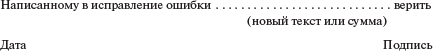 Корректурный способ применяется в тех случаях, когда ошибка не затрагивает корреспонденции счетов или она быстро обнаружена и не отразилась на итогах учетных записей. Сущность данного способа состоит в том, что ошибочный текст или сумма зачеркивается и над зачеркнутым пишут правильный текст или сумму. Зачеркивание производят тонкой линией, так, чтобы можно было прочесть зачеркнутое. При этом зачеркивается все число, даже если ошибка допущена только в одной цифре. Исправление ошибки оговаривается и подтверждается: в документах — подписями лиц, удостоверивших документ; в учетных регистрах — подписью лица, производящего исправление. Оговорку об исправлении делают на полях или в конце страницы, записывая в ней «Исправлено» и правильный текст или сумму.