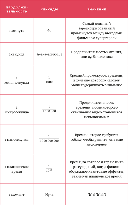 Философы в Древнем Китае играли в подобные игры разума. «То, что не поддается измерению, не может быть собрано в целое, — писал один из них. — Оно имеет размер в тысячу километров». В математическом смысле мгновение не имеет измерений. Оно не обладает ни длиной, ни протяженностью. Оно длится ноль секунд. Но, поскольку ноль, умноженный на ноль, равен нулю, два мгновения также составляют нулевое время. Это же относится и к десяти мгновениям, и к тысяче, и к миллиону. Получается, что любое исчисляемое количество мгновений будет в целом продолжаться ноль секунд.