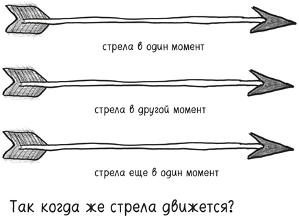 Идея: представьте себе стрелу, летящую в воздухе. Теперь мысленно остановите ее, как это произошло при расстреле Хладика. Стрела по-прежнему движется? Нет, конечно, нет — стоп-кадр по определению является застывшим. В любой отдельно взятый момент стрела неподвижна. Но если время состоит из моментов, а ни в один момент стрела не движется... тогда как же она может двигаться?