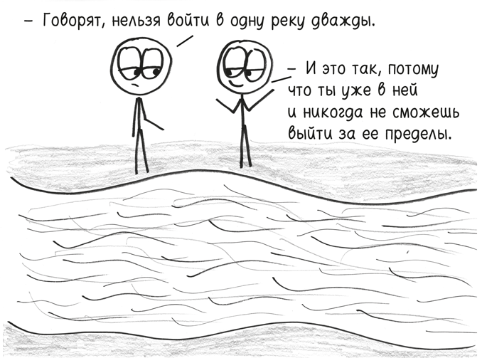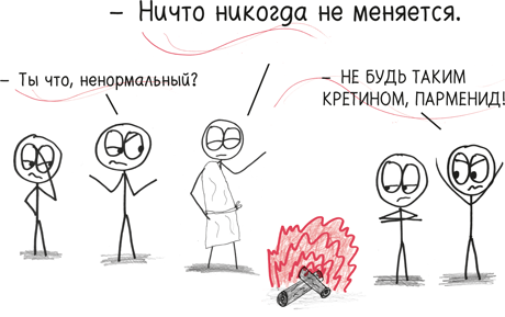 На самом деле, Парменид, миллион дней назад теми же самыми, что и сегодня, были только две вещи: (1) вездесущность изменений и (2) глубокомысленная и безнадежная неправильность твоей философии.