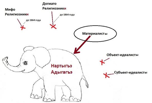 Чтобы отпугнуть адыгов от родного мифорелигиозного, чтобы унизить религию адыгов, примерно раз в месяц, публикуются статьи, о том, что у адыгов был тот или иной «языческий культ». К примеру «культ коня», «меча», «семейного очага» и т. д. Используя образ из индийской притчи, мы должны спросить: Да, это всё подлинные микро-фрагменты слона, а где наш слон?