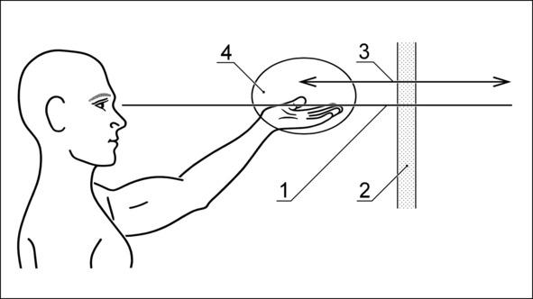 На рис. 2 наблюдение «ауры» ладони: (1) линия взгляда; (2) область максимального наведения фокуса; (3) схема деконцентрации взгляда: наведение фокуса на удаленный объект < — > наведение фокуса на кисть руки; (4) зона видения неоднородности ЭИП.