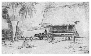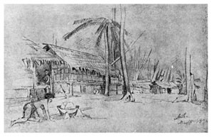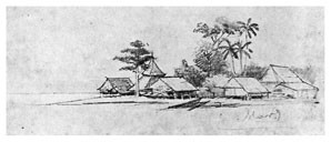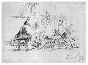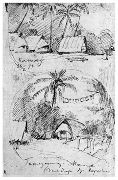 8 мая. Ждал парохода! Рисовал Бунгараю. В 4 часа отправился в Айялену. Красивый вид: гробницы семейства радьи Кильвару. Промок. Один из людей Макассара пришел с подарками (райск[ие] птиц[ы]), которому я отказал. <…>
