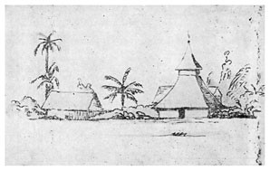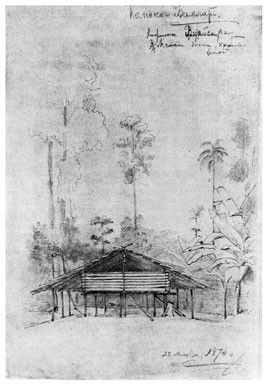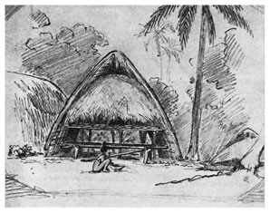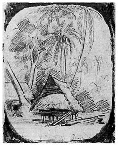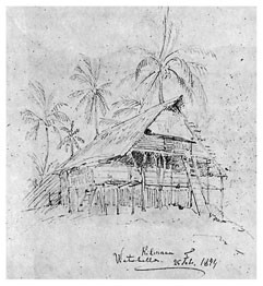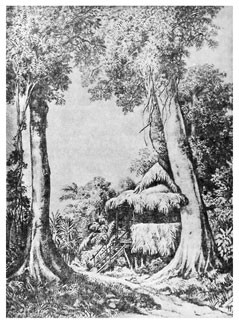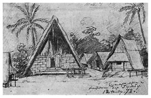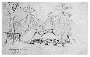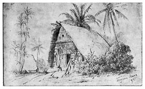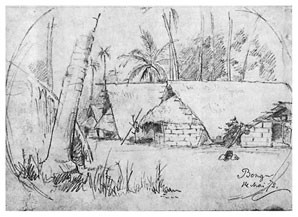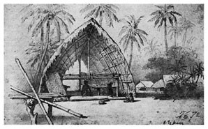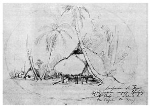 Я с таким нетерпением выскочил из шлюпки и направился по тропинке в лес, что даже не отдал никаких приказаний моим людям, которые занялись привязыванием шлюпки к ближайшим деревьям. Пройдя шагов 30 по тропинке, я заметил между деревьями несколько крыш, а далее тропинка привела меня к площадке, вокруг которой стояли хижины с крышами, спускавшимися почти до земли. Деревня имела очень опрятный и очень приветливый вид. Средина площадки была хорошо утоптана землею, а кругом росли пестролиственные кустарники и возвышались пальмы, дававшие тень и прохладу. Побелевшие от времени крыши из пальмовой листвы красиво выделялись на темно-зеленом фоне окружающей зелени, а ярко-пунцовые цветы китайской розы <Hibiscus rosa sinensis>[16] и желто-зеленые и желто-красные листья разных видов кротонов и Coleus оживляли общую картину леса, кругом состоящего из бананов, панданусов, хлебных деревьев <арековых>[17] и кокосовых пальм. Высокий лес кругом ограждал площадку от ветра.