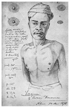 3 мая. Traubenförmige Brüste der Papua-Mädchen. – Kleiner Wuchs und Neigung zum fett werden. – Kinder von ♂ und ♁Papua haben lockiges Haar und einen bald mehr Papua-andere Malayen-typus. Ein Exemplar v. Ceram-Laut besonders bemerkenswert dadurch dass der Papua-typus fast nicht bemerklich ist, die Mutter aber von sehr pregnanter Papua-typus.[116]