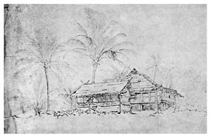 22, 23, 24, 25 сентября. Все эти дни я был занят постройкою хижины. Часов в 6 утра съезжал с плотниками на берег и оставался там до спуска флага. Моя хижина имеет 7 футов ширины и 14 длины и разгорожена пополам перегородкой из брезента (крашеная парусина). Одну половину я назначил для себя, другую для моих слуг – Ульсона и Боя. Так как взятых из Таити досок не хватило, то стены сделаны из дерева только наполовину, нижние; для верхних же, равно и двух дверей, опять служит брезент, который можно было скатывать. Для крыши заготовлены были особенным образом сплетенные из листьев кокосовой пальмы циновки; работу эту я поручил Бою. Пол, половина стен и стойки по углам были сделаны из леса, купленного в Таити и приспособленного на корвете. Сваи, верхние скрепления, стропила пришлось вырубать и выгонять уже здесь; но благодаря любезности командира корвета рук было много, постройка шла успешно.