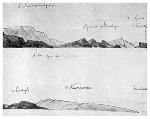 20 сентября. За ночь попутное течение подвинуло нас к северу миль на 20. Я рано поднялся на палубу, рассчитывая увидеть до восхода солнца вершины гор свободными от облаков. И действительно, горы ясно были видны и представляли мало отдельных вершин, а сплошную высокую стену почти повсюду одинаковой высоты. При восходе солнца вершина и подошва гор были свободны от облаков, посредине их тянулись белые strati <(слоистые облака)>.[10] Поднявшееся солнце осветило берег, на котором ясно можно было различить три или четыре параллельных, громоздившихся один над другим хребта. По мере того как мы подвигались вперед, вид берега изменялся. Террас более не было, а к высоким продольным хребтам примыкали неправильные поперечные ряды холмов, между которыми, вероятно, протекали речки. Растительности было более.