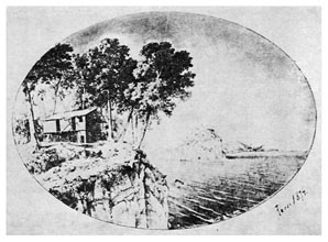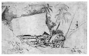 Часам к 3 высланы с корвета люди, занялись очисткою места от кустов и мелких деревьев, плотники принялись за постройку хижины, начав ее с забивки свай под тенью двух громадных Canarium commune.
