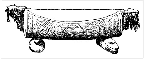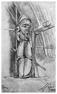 Хотя в деревне не оказалось живой души, но повсюду видны были следы недавно покинувших ее обитателей: на площадке иногда вспыхивал тлеющий костер, здесь валялся недопитый кокосовый орех, там – брошенное второпях весло; двери некоторых хижин были тщательно заложены какою-то корою и заколочены накрест <пластинами расколотого бамбука>.[18] У двух хижин, однако, двери остались открытыми: видно, хозяева куда-то очень торопились и не успели их запереть. Двери находились на высоте в двух футах, так что двери представлялись скорее окнами, чем дверьми, и составляли единственное отверстие, чрез которое можно было проникнуть в хижину. Я подошел к одной из таких дверей и заглянул в хижину. В хижине темно – с трудом можно различить находящиеся в ней предметы: высокие нары из бамбука, на полу несколько камней, между которыми тлел огонь, служили опорой стоявшего на них обломанного глиняного горшка; на стенах висели связки раковин и перьев, а под крышей, почерневшей от копоти, – человеческий череп. Лучи заходящего солнца освещали теплым светом красивую листву пальм; в лесу раздавались незнакомые крики каких-то птиц. Было так хорошо, мирно и вместе чуждо и незнакомо, что казалось скорее сном, чем действительностью.