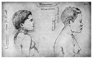 1) Волоса смеси 6 серамцев <и> 9 папуасок курчавы; некоторые – более папуасский тип, другие – более малайский. Между ними головы встре[чаются] очень брахиоцефальные.