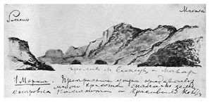 21 сентября. Берег залива Астроляб в том месте, где «Витязь» бросил якорь, горист; несколько параллельных цепей гор различной вышины тянутся вдоль берега и только на WNW берегу прерываются низменностью. NW берег горист, хотя не так высок, как южный, и оканчивается невысоким мысом.
