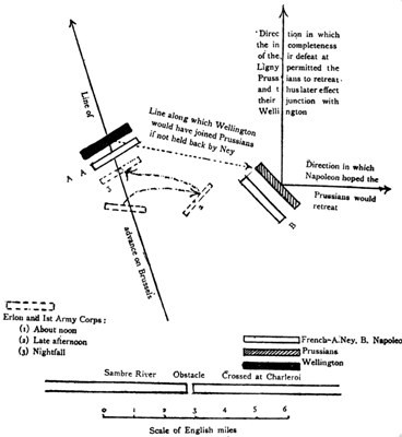 Wellington and Blucher did not, under the circumstances, oppose to Napoleon a single body drawing its life from one stream of communications. They did not in combination command a force defending one goal; they commanded two forces defending two goals. The thorough defeat of one would throw it back away from the other if the attack were delivered at the point where the two just joined hands; and the English[1] or western half under Wellington was bound to movements actually contrary to the Prussian or eastern half under Blucher in case either were defeated before the other could come to its aid.