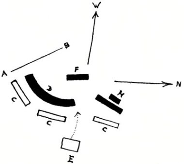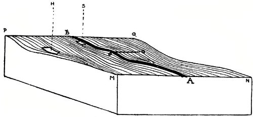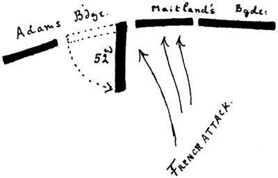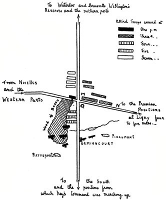 a second shallow valley falling away. This second valley does not precisely continue the direction of the first, but turns rather more to the north. In the first slight decline of this second valley, and a few hundred yards west of the road, lies the country-house called Hougomont, and just behind it lay the western end of Wellington’s line. The whole position, therefore, if it were cut out as a model in section from a block of wood, might appear as does the accompanying plan.