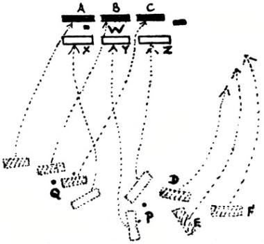 His doubtful chance of success in such a hazard obviously lay in his being able to attack each enemy separately: that is, to engage first one before the second came to his aid; then the second; and thus to defeat each in turn. The chance of victory under such circumstances is slight. It presupposes the surprise of the two allied adversaries by their single opponent, and the defeat of one so quickly that the other cannot come to his aid till all is over. But no other avenue of victory is open to a man fighting enemies of double his numerical strength; at least under conditions where armament, material, and racial type are much the same upon either side.