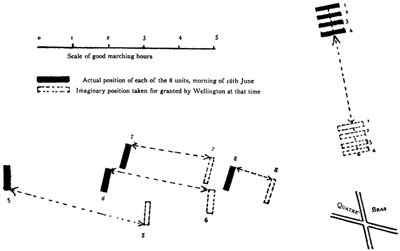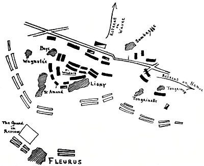 The actual positions of the two combined commands, the command of Blucher and the command of Wellington, which between them held the long line between Tournay and Liège, will be grasped from the sketch map upon the next page.