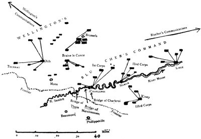 I will put this strategical position before the reader in the shape of an English parallel in order to make it the plainer, and I will then, by the aid of sketch maps, show how the Allies actually lay upon the Belgian frontier at the moment when Napoleon delivered his attack upon it.