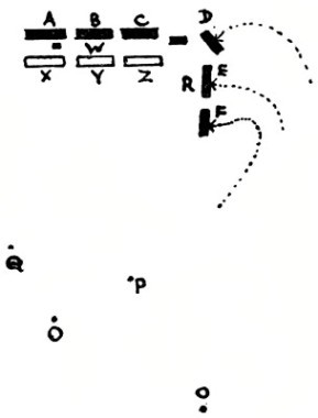 Such a battle at Newbury would correspond to the battle at Ligny (let it be fought upon a Friday). Meanwhile, the western half, hurrying up in aid, has failed to effect a junction before the eastern half was defeated, comes up too late above Newbury, and finding it is too late, retires upon Abingdon. The victorious invader pursues them, and at noon on the second day engages them in a long line which they hold in front of Abingdon.
