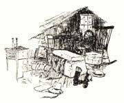 We had expected it to be an empty place, of dust, cobwebs, and darkness. It was dusty enough and none too light, but it was far from empty. Four spinning-wheels of varying sizes were in plain view between us and the front window. A dozen or more of black, straight-backed chairs of the best and oldest pattern were mingled with a mass of other ancient relics—bandboxes, bird-cages, queer-shaped pots and utensils, trenchers, heaps of old periodicals, boxes of trinkets, wooden chests of mystery—a New England garret collection such as we had read of, but never seen, the accumulation of a century and a half of time and change. We looked at it greedily, for we had long ago acquired a hunger for such drift as that, left by the human tide. I said in a dead, hopeless tone: