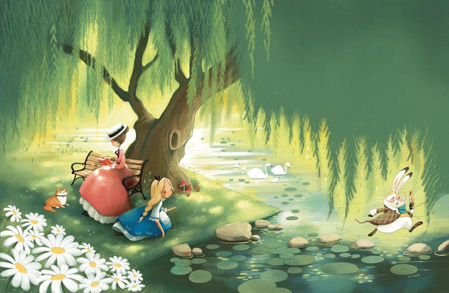 Алисе надоело сидеть на пригорке рядом с сестрой и ничего не делать. Раза два она заглянула украдкой в книгу, которую та читала, но там не было ни разговоров, ни картинок. «Какой толк в книге, – подумала Алиса, – если в ней нет ни картинок, ни разговоров?» Потом она стала раздумывать (насколько вообще это возможно в такой невыносимо жаркий день, когда одолевает дремота), стоит ли ей вставать, чтобы нарвать маргариток и сплести венок, или нет, как вдруг Белый Кролик с розовыми глазками пробежал мимо неё.