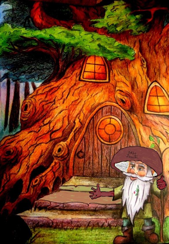 Ручки у него сухонькие, похожие на сучки деревьев, на голове шляпка подберёзовика, вместо носа — шишка еловая, а на ногах старые залатанные лапоточки на босу ногу надеты. Встал старичок, и колени у него от старости заскрипели.