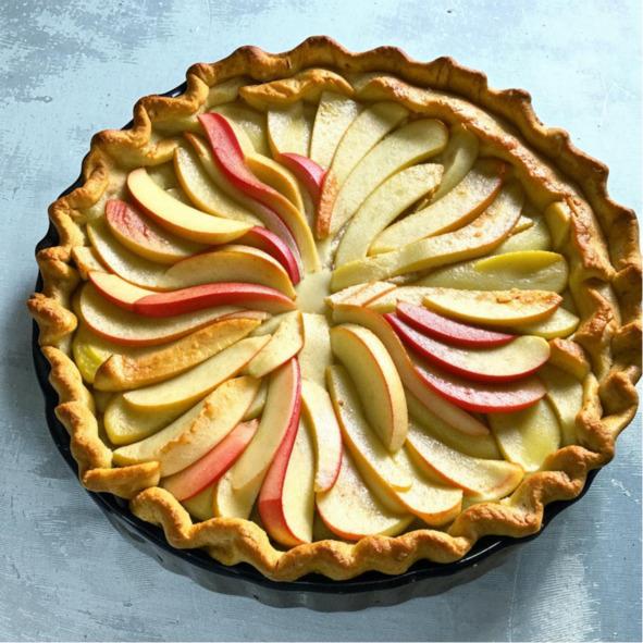 Выложить яблоки на тесто, накрыть оставшимся тестом и запекать в духовке при 180° C 30—40 минут.