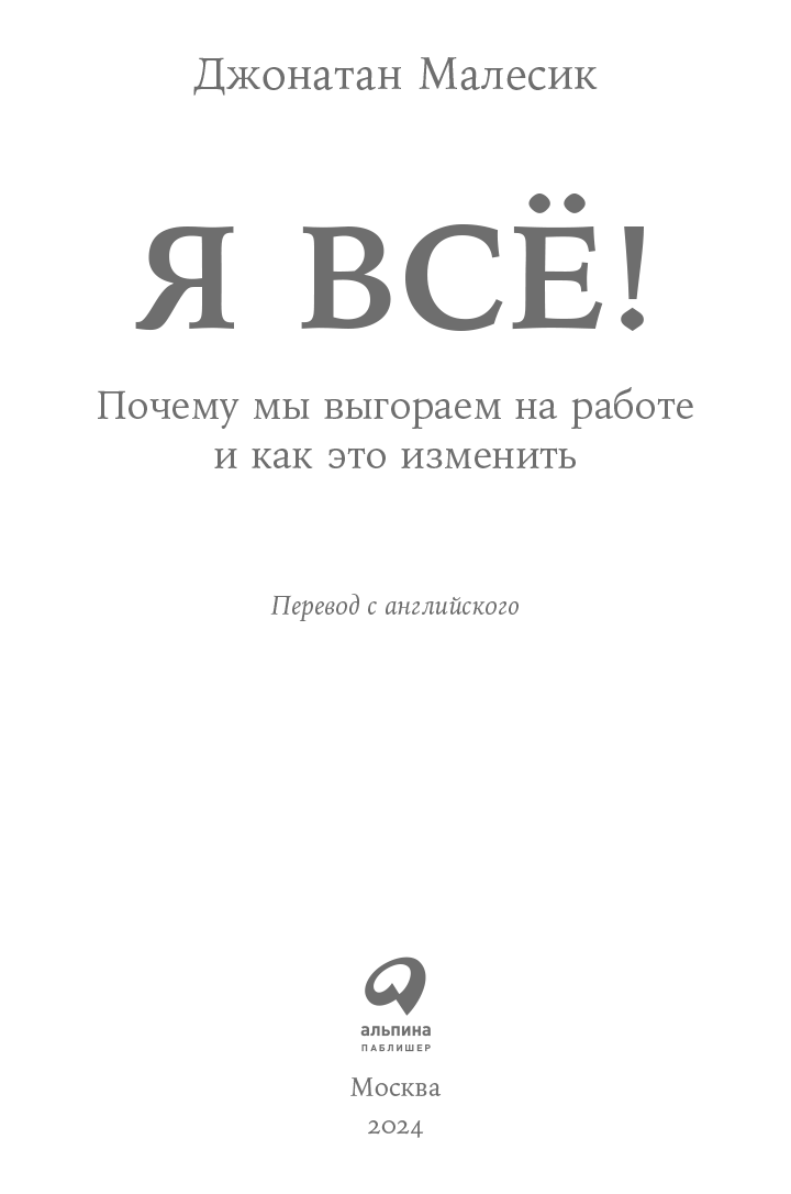 Замысел книги «Я всё!» происходит из моего желания понять, почему миллионы работников из разных сфер деятельности лишаются сил, необходимых для выполнения своих задач, и почему это заставляет их чувствовать себя неудачниками. Для меня выгорание — это ощущение, что ты разрываешься между ожиданиями от работы и реальностью. Я уверен, что выгорание — это культурный феномен, который широко распространился в последние полвека, однако корнями он уходит в наше убеждение, что работа — это способ не только заработать деньги, но и обрести чувство собственного достоинства, сформировать характер, найти смысл жизни. В сущности, несмотря на всеобщую озабоченность по поводу выгорания, само это явление продолжает существовать, потому что мы уважаем эти ценности. Мы боимся потерять смысл, который обещает нам работа. При этом условия труда, типичные для США и других богатых постиндустриальных стран, мешают нам достичь того, к чему мы стремимся.