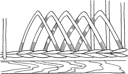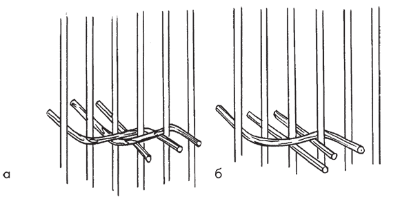 Закрепленный прут огибает сразу два стоячка, затем 2-й прут выводится из-под 1-го и огибает два стоячка над ним. 3-й прут кладется внахлест над 1-м и 2-м прутьями.