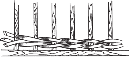Если вы вбили четное количество стоячков, то плетение следует производить в два прута, в результате чего образуется шахматка (рис. 2). Закрепите прут и обходите им спереди, а затем сзади сразу по два стоячка. Если вы хотите добиться контраста, то используйте прутья разного цвета.